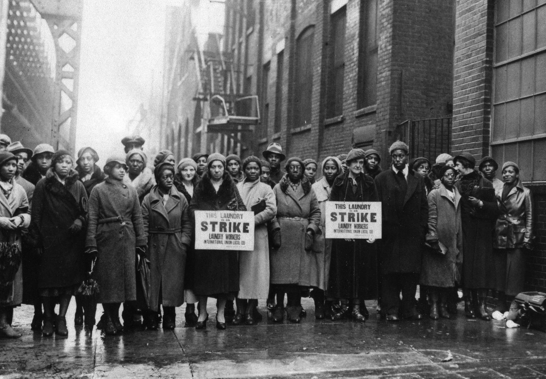 postcard caption: Historic Brooklyn Series #322. Local 135 workers on strike, picketing Colonial Laundry at Lexington and Grand Avenues. Clinton Hill, Brooklyn – 1934.